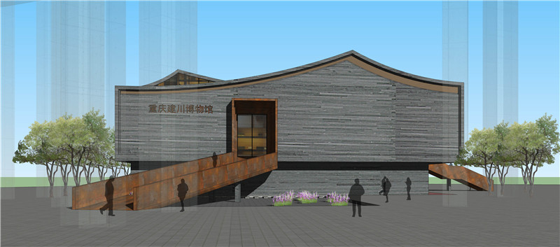 项目位于高架桥下,建筑为游客中心,游客的进入流线与出口流线均通过此建筑。功能梳理为:售票、接待、办公、纪念品售卖以及单身宿舍。通过坡道进入建筑,提升人口流线。通过屋顶脊线的变化呼应重庆“山地”的文脉特征。